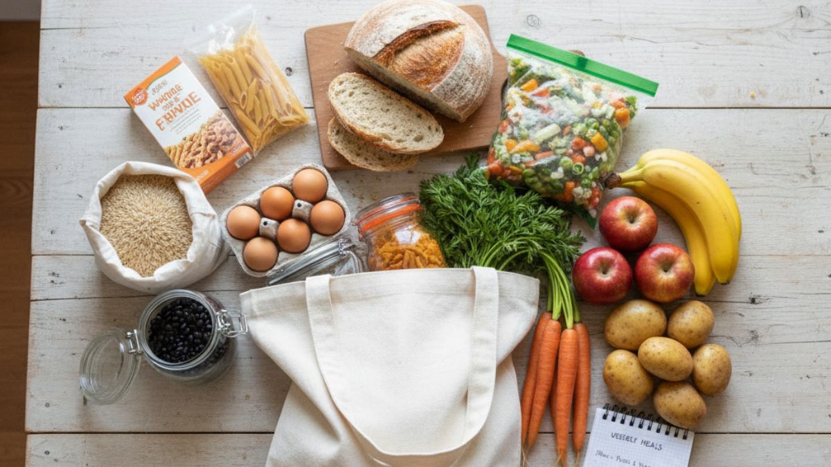 - Plan around staples: rice, beans, pasta, oats, eggs, potatoes, seasonal produce.